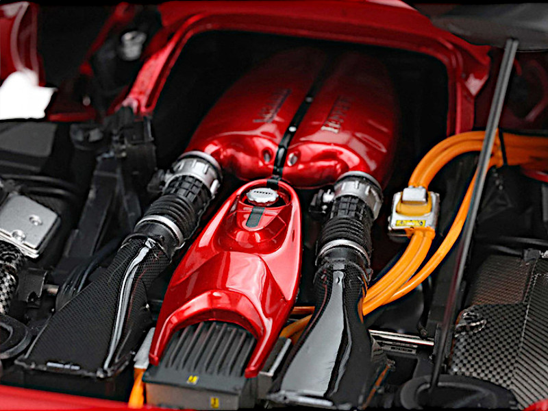 - Red fire diffusers and engine bay, emphasizing Ferrari’s bold DNA.